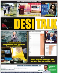October 3, 2025 Chicago, IL. Vol. XXIX, No. 40 www.desitalkchicago.com Published by Parikh Worldwide Media, LLC. community c o l o r s IN CHICAGO PHOTOS: X@DRSJAISHANKAR,REUTERS,COURTESYTHEWASHINGTON POST PAGES 12,14 Viksit Bharat Run 2025 PAGE 19 PAGE 17 Support grows For Krishnamoorthi’s Senate Run PAGE 15 OFBJP, Diaspora Celebrate Modi @75 S. Jaishankar declares United Nations in crisis, India ready for more responsibilities Where H-1B visa holders are from, who hires them and what they earn PAGE 14 PAGE 8 PAGE 15 Kiran Desai’s ‘Magnificent Saga’